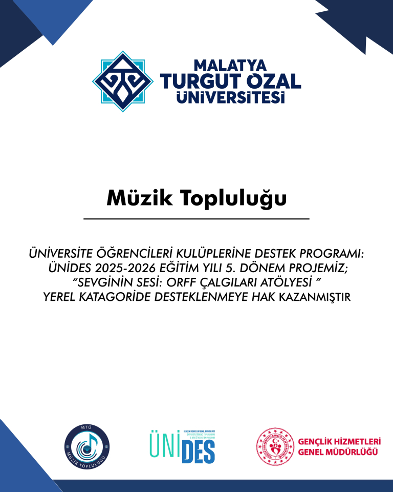 T.C. Gençlik ve Spor Bakanlığı Gençlik Hizmetleri Genel Müdürlüğü tarafından yürütülen Üniversite Öğrenci Toplulukları İş Birliği ve Destek Programı (ÜNİDES) 5. Dönem kapsamında bölümümüz Müzik Topluluğu’nun projesi desteklenmeye hak kazandı. Öğr. Gör. Harun Barış’ın akademik danışmanlığını yürüteceği “Sevginin Sesi: Orff Çalgıları Atölyesi” başlıklı proje yerel olarak destek alacak.