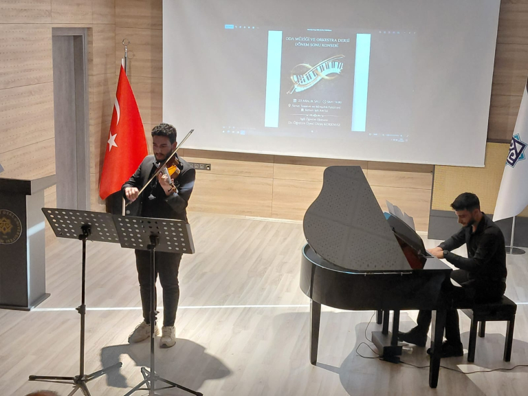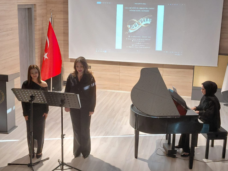 Dr. Öğr. Üyesi Olcay Korkmaz yürütücülüğünde hazırlanan dönem sonu konserinde öğrenciler; klasik müzikten Türk müziğine uzanan geniş bir repertuvardan eserler seslendirdi. Program kapsamında keman, piyano ve şan performansları sergileyen öğrenciler, izleyicilerden büyük beğeni topladı.